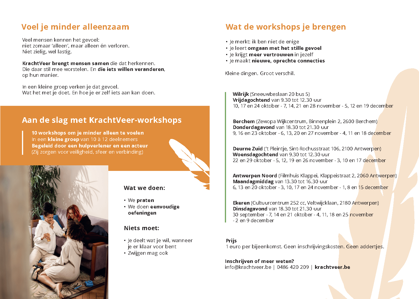 KrachtVeer vzw organiseert initiatieven die mensen voorbij hun eenzaamheid helpen. Sinds 2021 organiseert KrachtVeer reeksen workshops voor groepen van maximaal 15 deelnemers en dit in verschillende wijken van Antwerpen. KrachtVeer helpt de deelnemers om hun gevoelens van eenzaamheid te overwinnen.